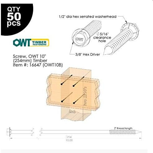 OZCO Ornamental Wood Ties (OWT) Timber Screws are pre-engineered heavy duty fasteners that make building projects faster and easier. Available in sizes ranging from 1-3/4" to 12", these screws are perfect for any wood-to-wood construction project. The special coating ensures smooth penetration without splitting wood, and no pre-drilling is required. Each screw features a built-in washer and a standard 3/8" hex head that matches all OZCO screws and bolts for convenient installation.